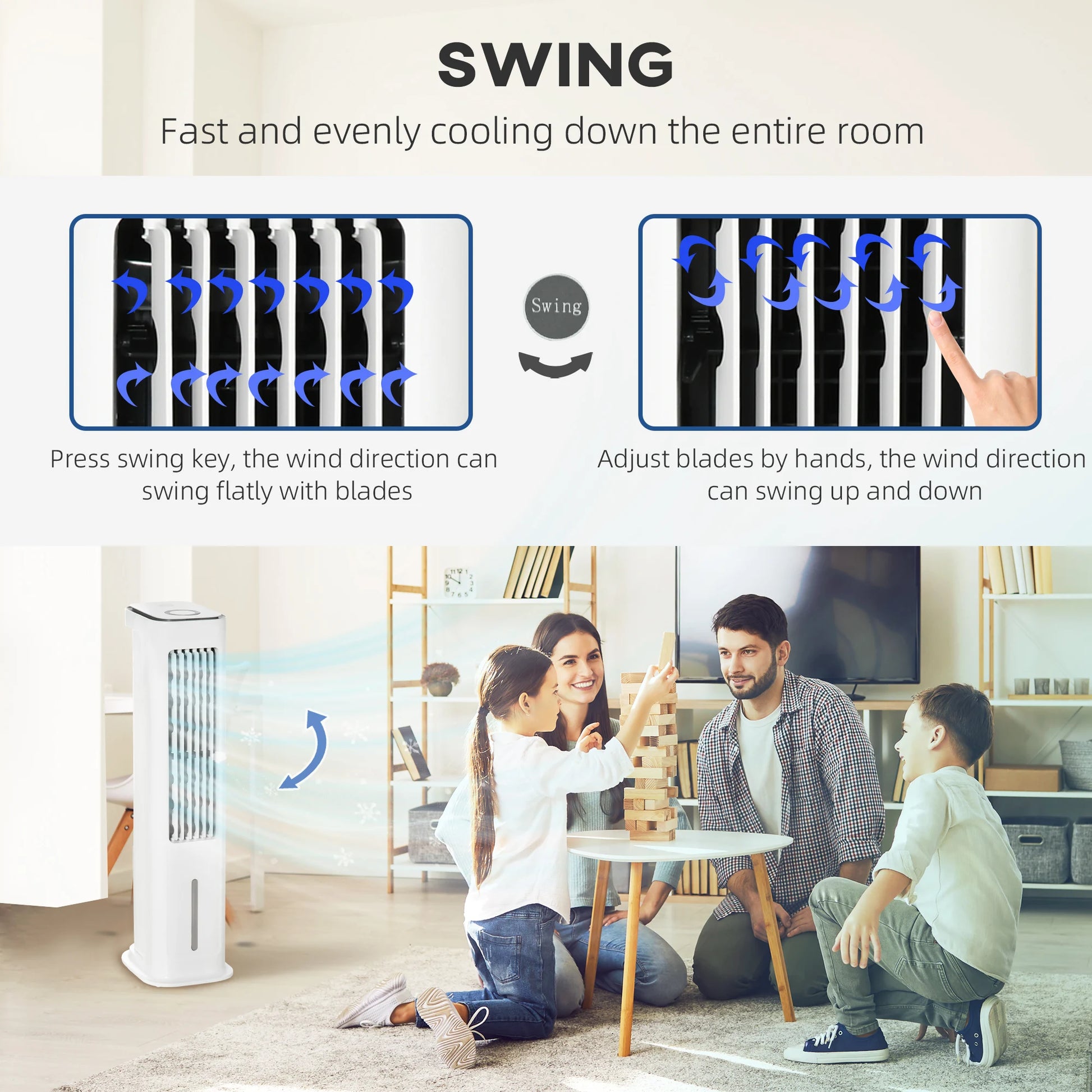 - Wide Coverage: 60° oscillating function and manually adjustable vertical air flow ensure a broad, even distribution of cool air.